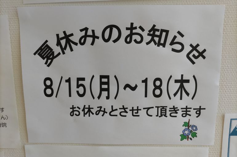 明日、8月15日~18日まで夏休みとさせて頂きます。